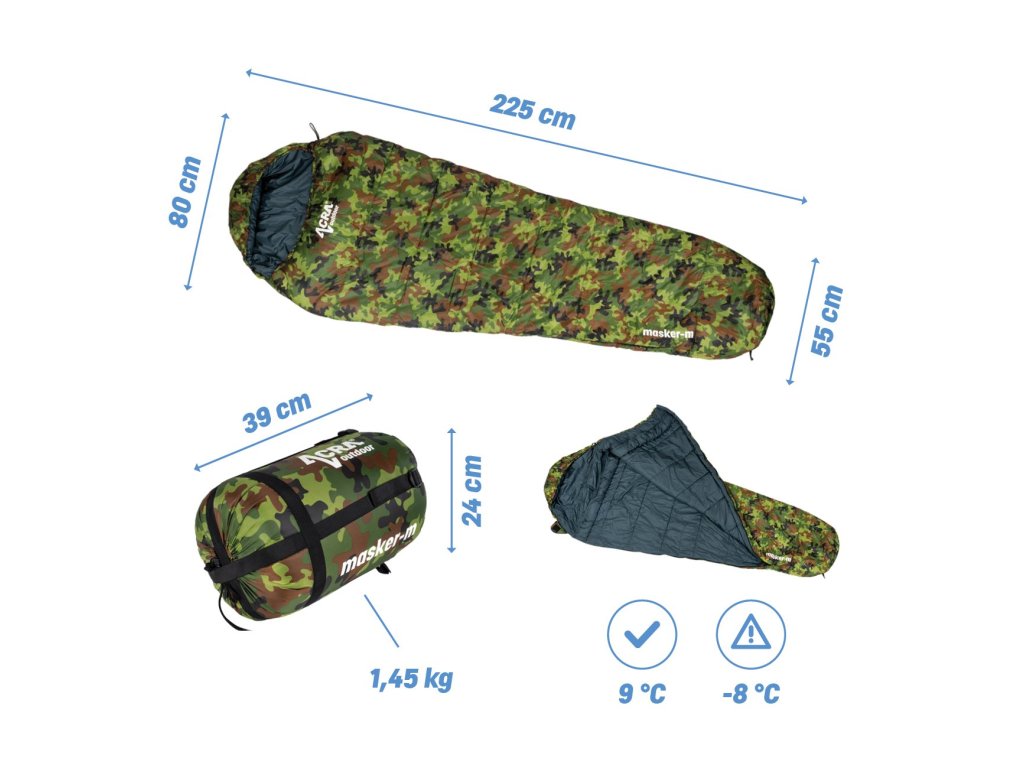 Spacák Acra Masker M - komfort a maskování pro vaše outdoorové dobrodružství!Hledáte spacák, který vám zaručí komfortní spánek v přírodě a zároveň vám pomůže splynout s okolím? Pak je Acra Masker M tou pravou volbou! Díky svému mumiovému střihu a hřejivé izolaci je ideální pro kempování, rybaření a turistické výpravy od pozdního jara do brzkého podzimu. Navíc jeho maskáčové zbarvení vám pomůže splynout s okolím a vychutnat si klid a pohodu v přírodě. Hlavní vlastnosti: Mumiový střih: Anatomicky tvarovaný mumiový střih perfektně obepíná tělo a zaručuje maximální izolaci a tepelný komfort. Lehká a hřejivá izolace: Izolace z dutého vlákna 2x150 g/m2 vás udrží v teple i v chladnějších nocích. Oboustranný zip: Spacák se snadno otevírá a zavírá pomocí oboustranného zipu. Maskáčové zbarvení: Spacák vám pomůže splynout s okolím a vychutnat si klid a pohodu v přírodě. Kompaktní velikost: Spacák se dá snadno sbalit do malého batohu.Vhodný pro jarní, letní a podzimní použití: Spacák je ideální pro výlety do přírody, kdy teplota neklesne pod 5°C. Technické specifikace: Rozměry: 225 cm x 80 cm (v nohou 55 cm)Hmotnost: 1,45 kgIzolace: Duté vlákno (hollow fibre) 2x150 g/m2Teplotní komfort: -8°C až +9°C (doporučeno používat nad 5°C)Barva: MaskáčováMateriál: Vrchní materiál: PES 190T; Vnitřní vložka: Pongee Acra Masker M je skvělý spacák pro všechny, kteří si chtějí užít komfortní spánek v přírodě a zároveň si zachovat nenápadnost. Díky svému mumiovému střihu, lehké izolaci, kompaktní velikosti a maskáčovému zbarvení je ideální pro kempování, rybaření a turistiku.