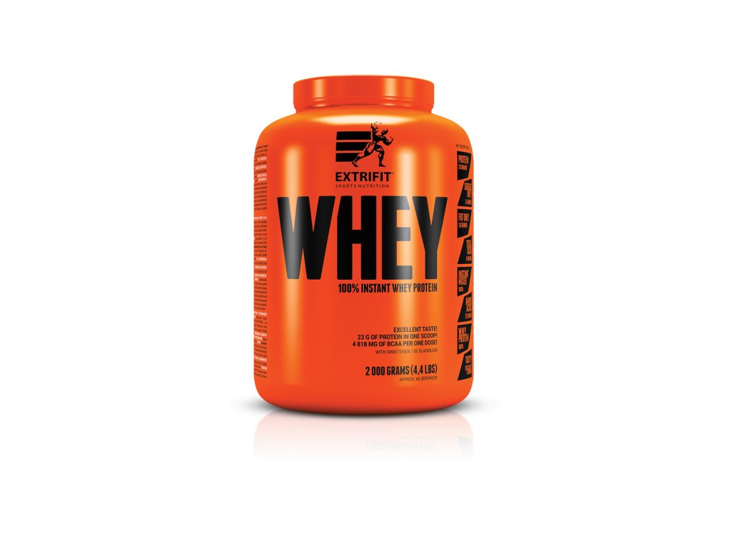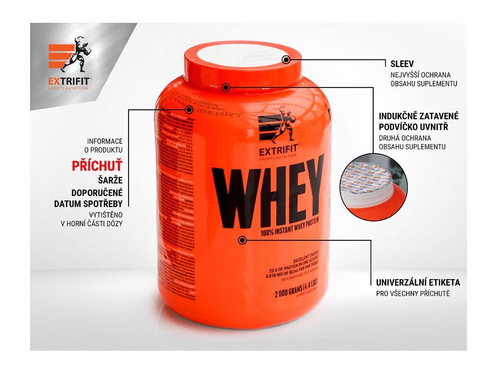 100 % Whey Protein je plně instantní, skvěle se rozpouští a jeho příprava je tedy velmi snadná. Hotový nápoj má velmi příjemnou konzistenci. Příjem tohoto vysoce kvalitního zdroje bílkovin přispívá k růstu svalové hmoty a k jejímu udržení v situacích, kdy je ohrožena katabolizací. 100 % Whey Protein od Extrifitu je výborně stravitelný protein za skvělou cenu. Vytvořili jsme proteinový nápoj pro každého, kdo chce vyzkoušet kvalitu Extrifit a přitom chce šetřit. 100 % Whey Protein je ryzí syrovátkový protein. A o to jde! Ne každý potřebuje mít v proteinu například superdrahé pravé jahody... Protein si kupujete, protože chcete protein. A tady ho máte. Je kvalitní, dobře se rozpouští a dobře chutná. V každé odměrce tohoto proteinu je plných 23 g bílkovin nejvyšší kvality. Hlavní proteinová složka je evropského původu.
